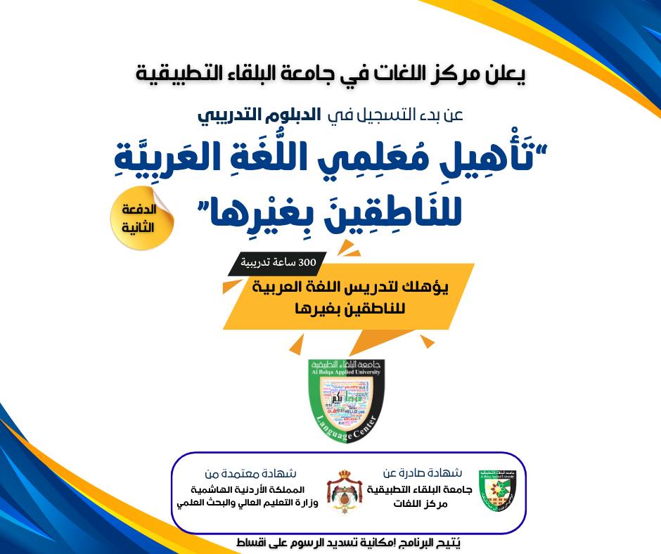 يعلن مركز اللغات – جامعة البلقاء التطبيقية عن بدء التسجيل في الدفعة الثانية من هذا الدبلوم التدريبي المعتمد، (آلية ميسّرة لتسديد رسوم).